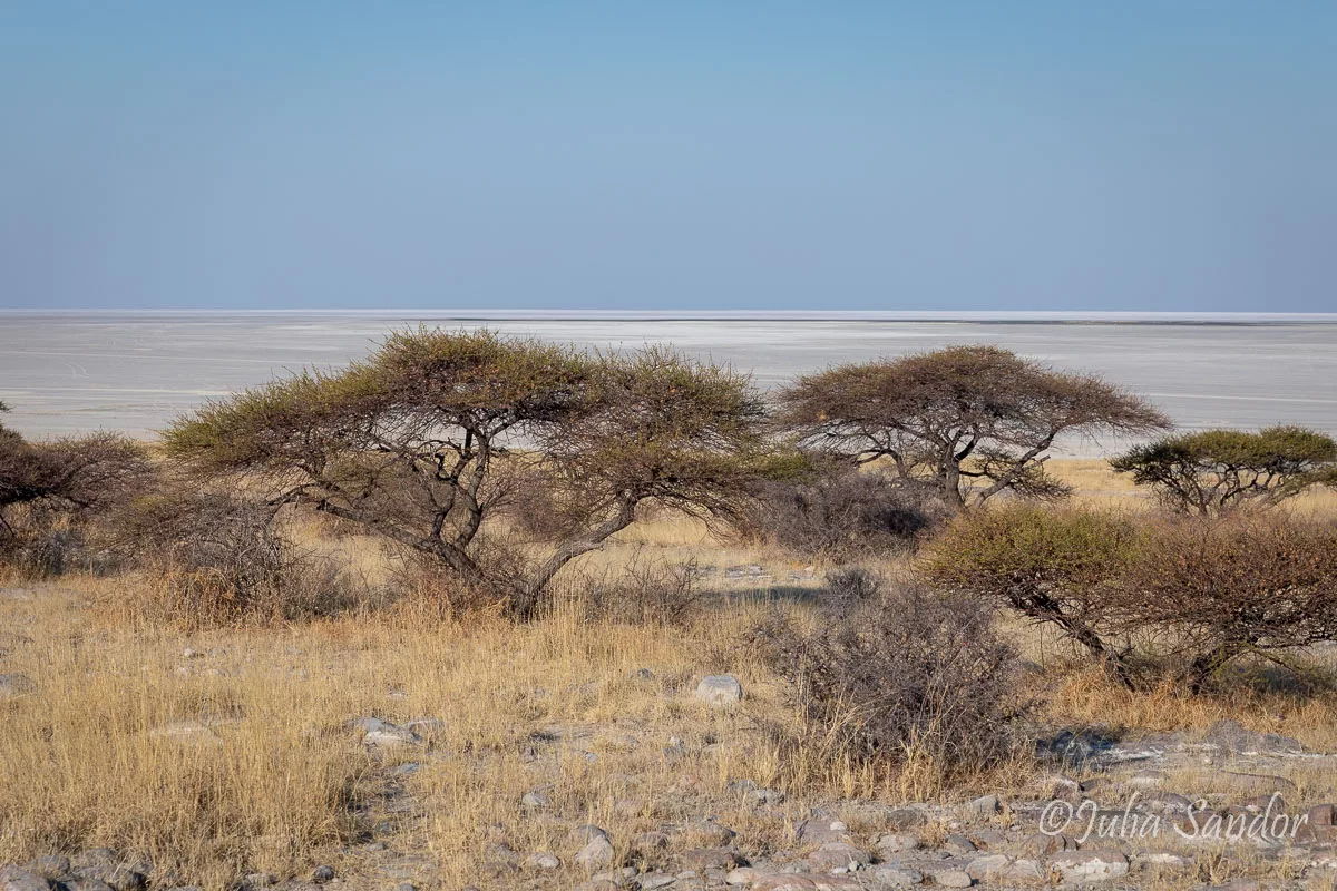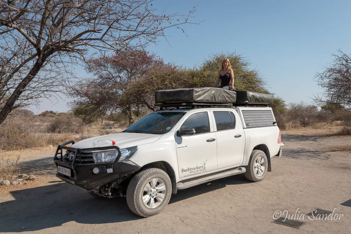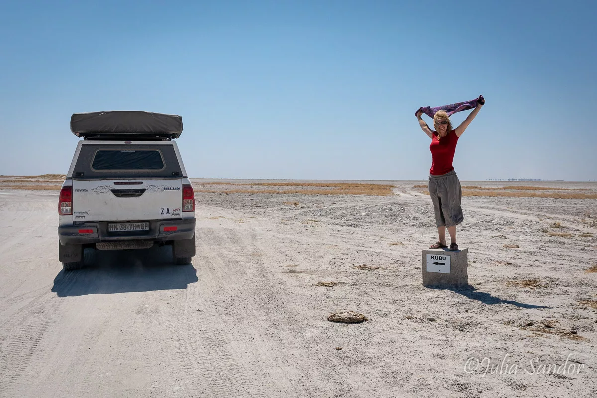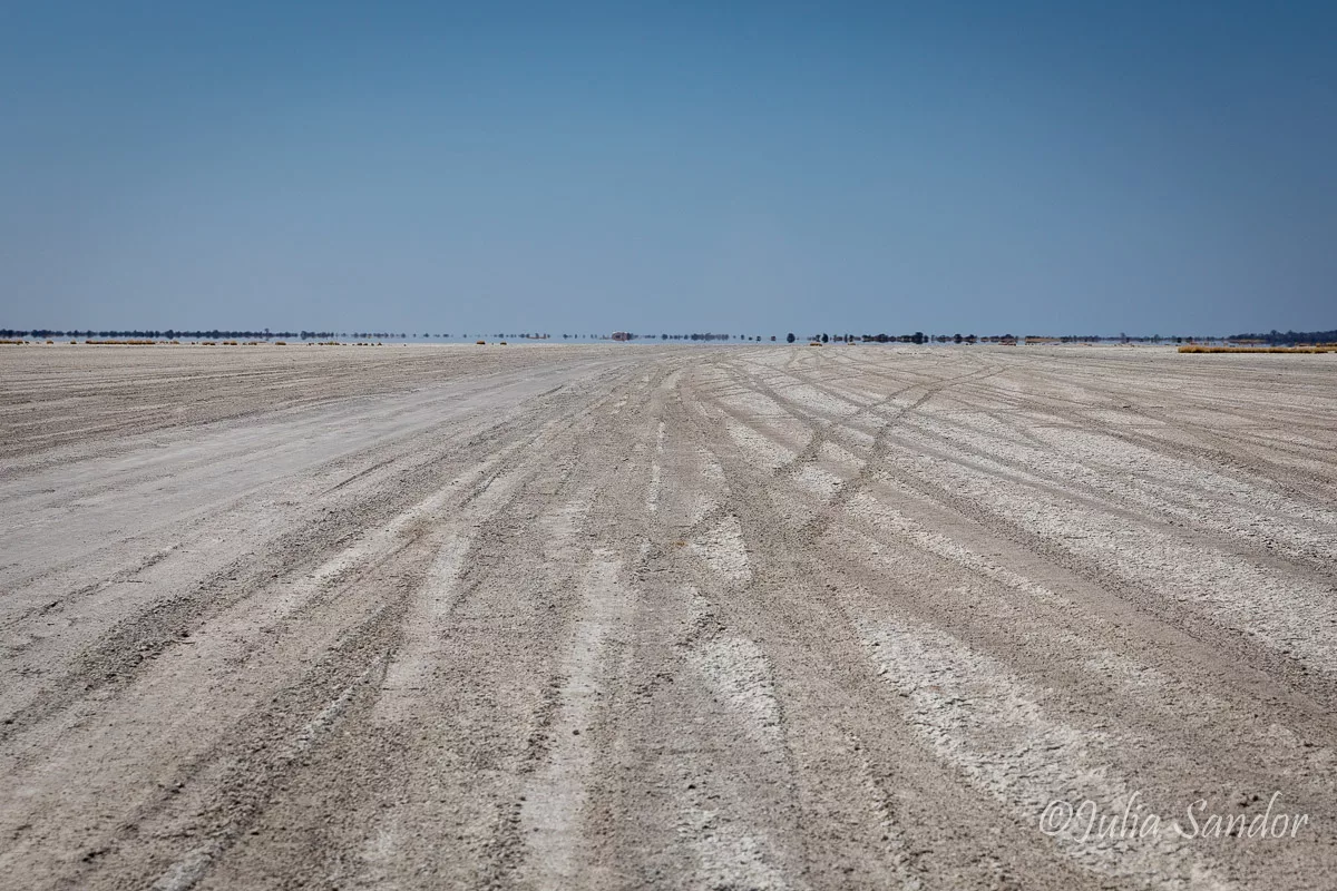 To reach Kubu Island the sandy drive is about 45 kms, first leading through Mopane bushland downwards to the former lake. From the “coastline” it is kind of an exaggeration to talk about a road: a better definition would be endless sandy and dusty tracks through the plain – sometimes difficult to guess which track is the right one. To get to the island you do need a 4×4 vehicle, but the road from the South is not difficult to drive – at least not now, in the dry season. However, the road from the North, which we tried in 2016 is much more challenging.