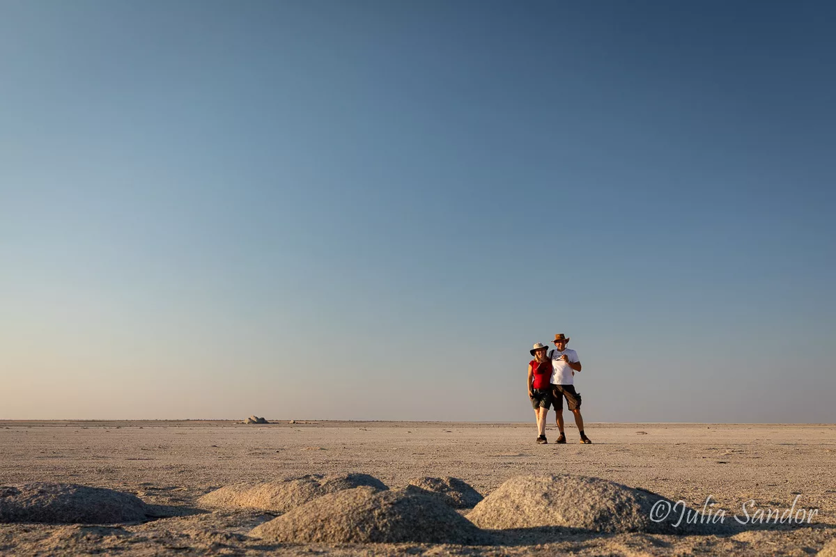We choose our camp site below 3 majestic baobab trees, set up the roof tent, have a light lunch, drink a good espresso – thanks to Wacaco, our travel coffee machine and wait in the shade for the biggest heat to pass. At 16h we collect our photo gear, put on our hiking shoes and start our discovery around Kubu Island. It is the perfect timing for seeing the landscape in the golden light of the afternoon sun. The baobab trees and rocks give a wonderful foreground to the endless sand pan. We climb to one of the highest points on the island to see the setting sun over the pan.