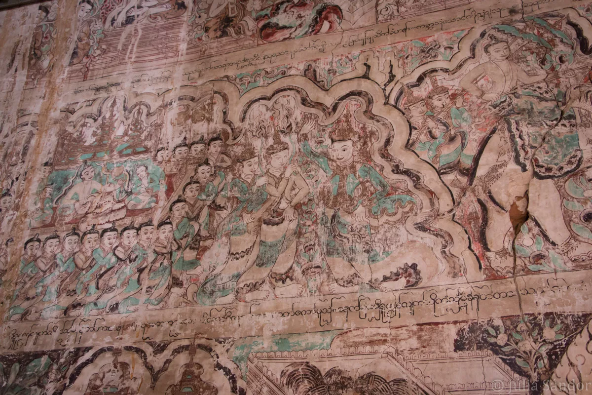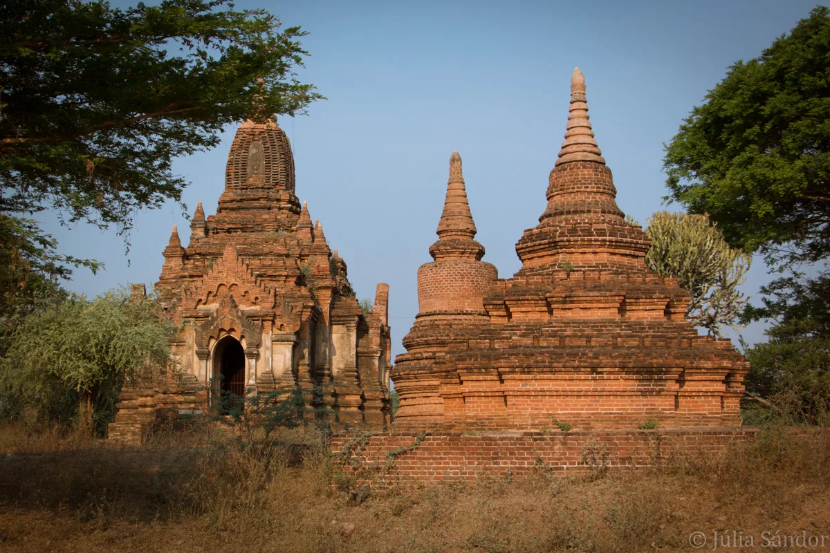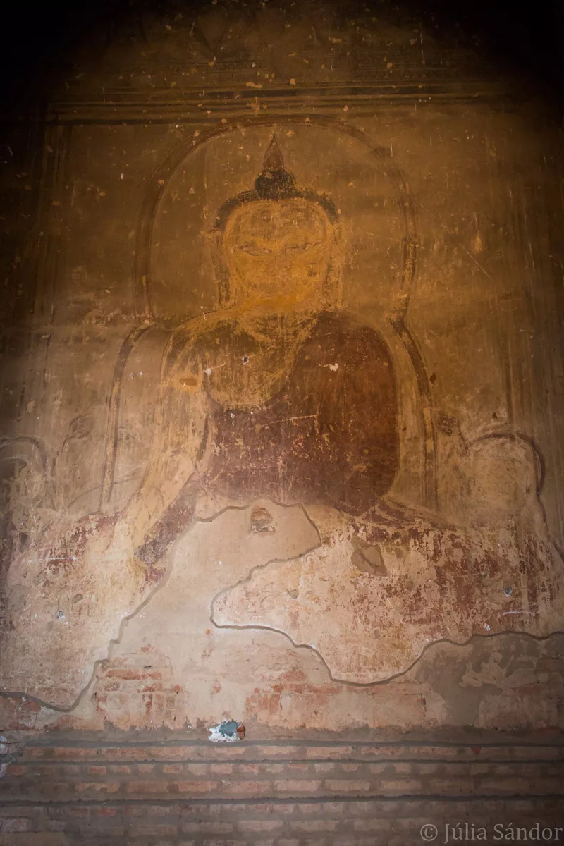 Bagans´ temples were built mainly between the 11th and 13th century, when Bagan was the seat of the Myanmar dynasty, and were renovated widely during the last 3 decades. There are different architectural styles: some square buildings have narrow and dark corridors, 4 entrances facing each direction, others have bright spacious interiors. The stupas stand out with their beautiful, often golden cone tops reaching into the sky. On some pagodas we could recognize Hindi style marks, on others elements of the Chinese architecture.