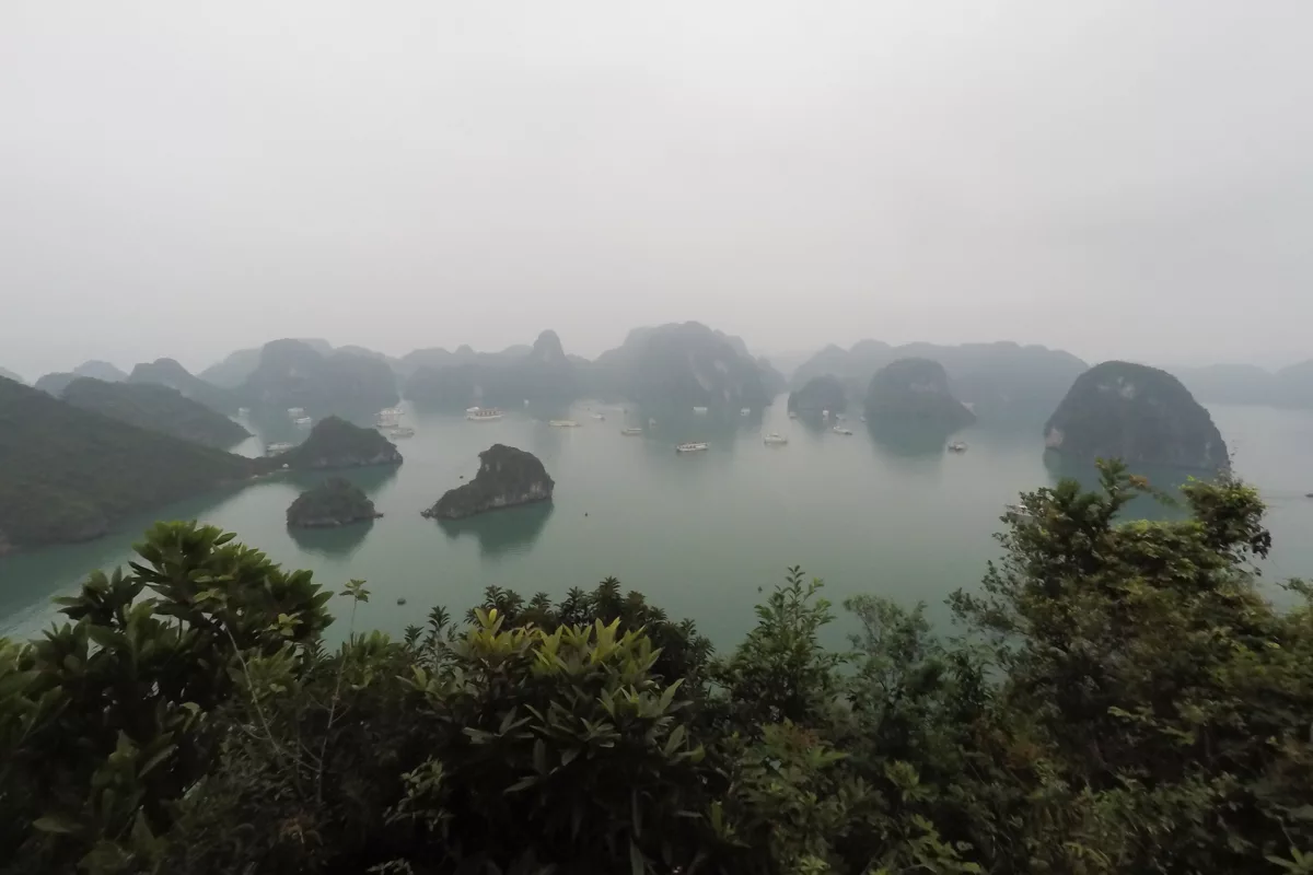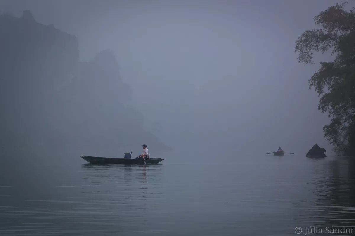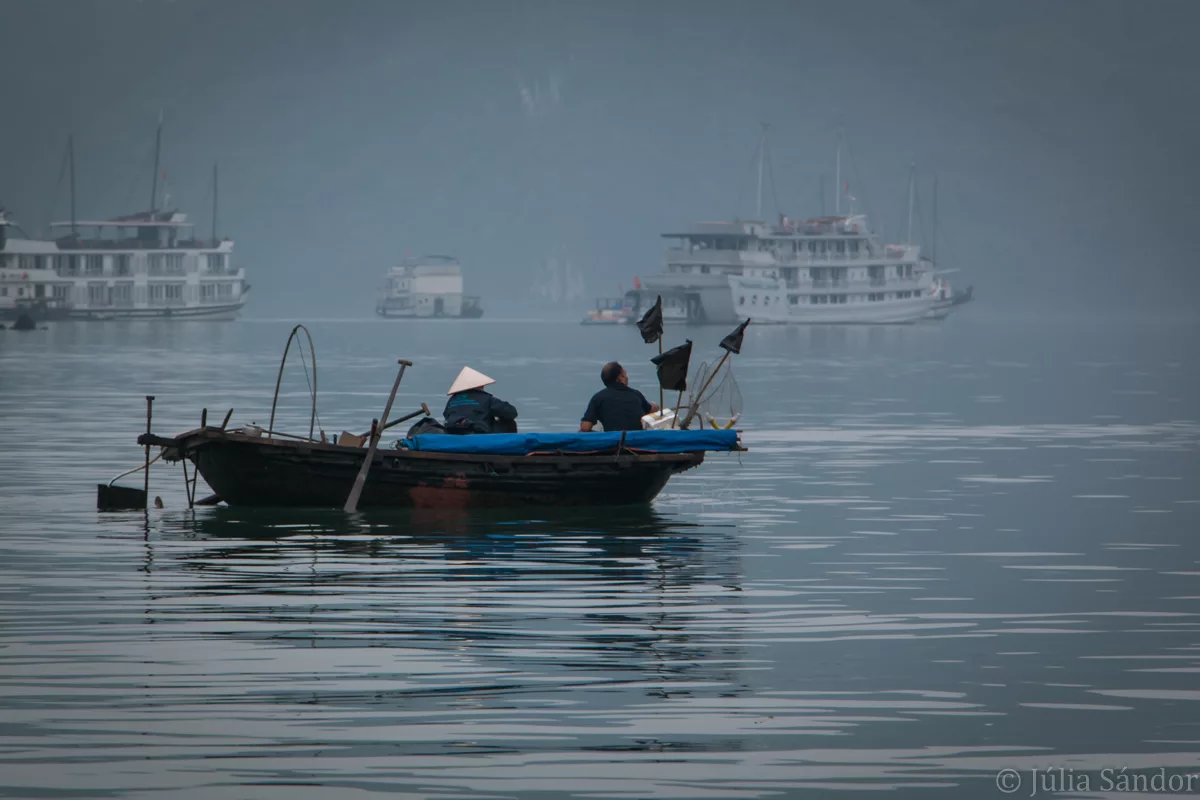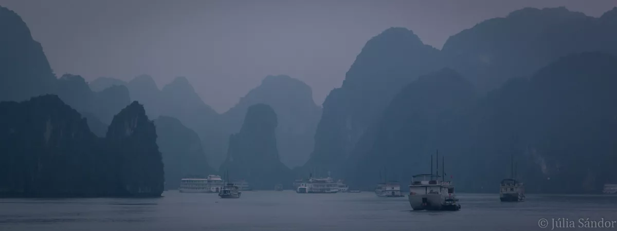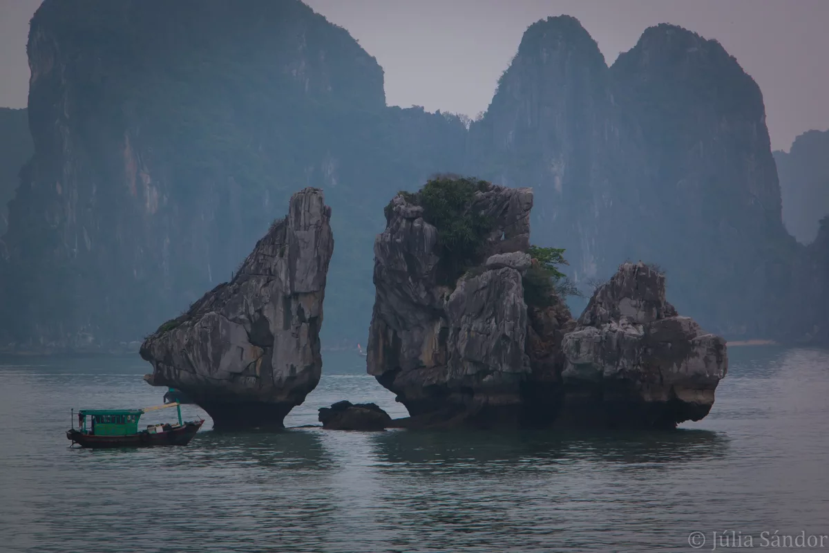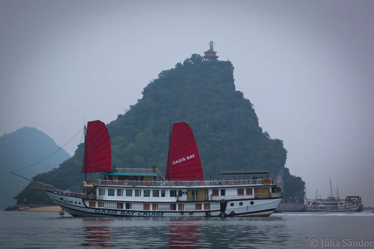After a wonderful day strolling through the Old Quarters and some other sights of Hanoi, we started our 3 day (2 nights) cruise trip in Ha Long Bay. The Bay is amazing, although in this time of the year the weather is rather foggy, as you will see on the pictures. Still, the small islands and cliffs – gems, dropped there by dragons, to protect Vietnam against invaders, as the legend tells – provide unique scenery, the fog making it mystical, magical, but not that photogene.