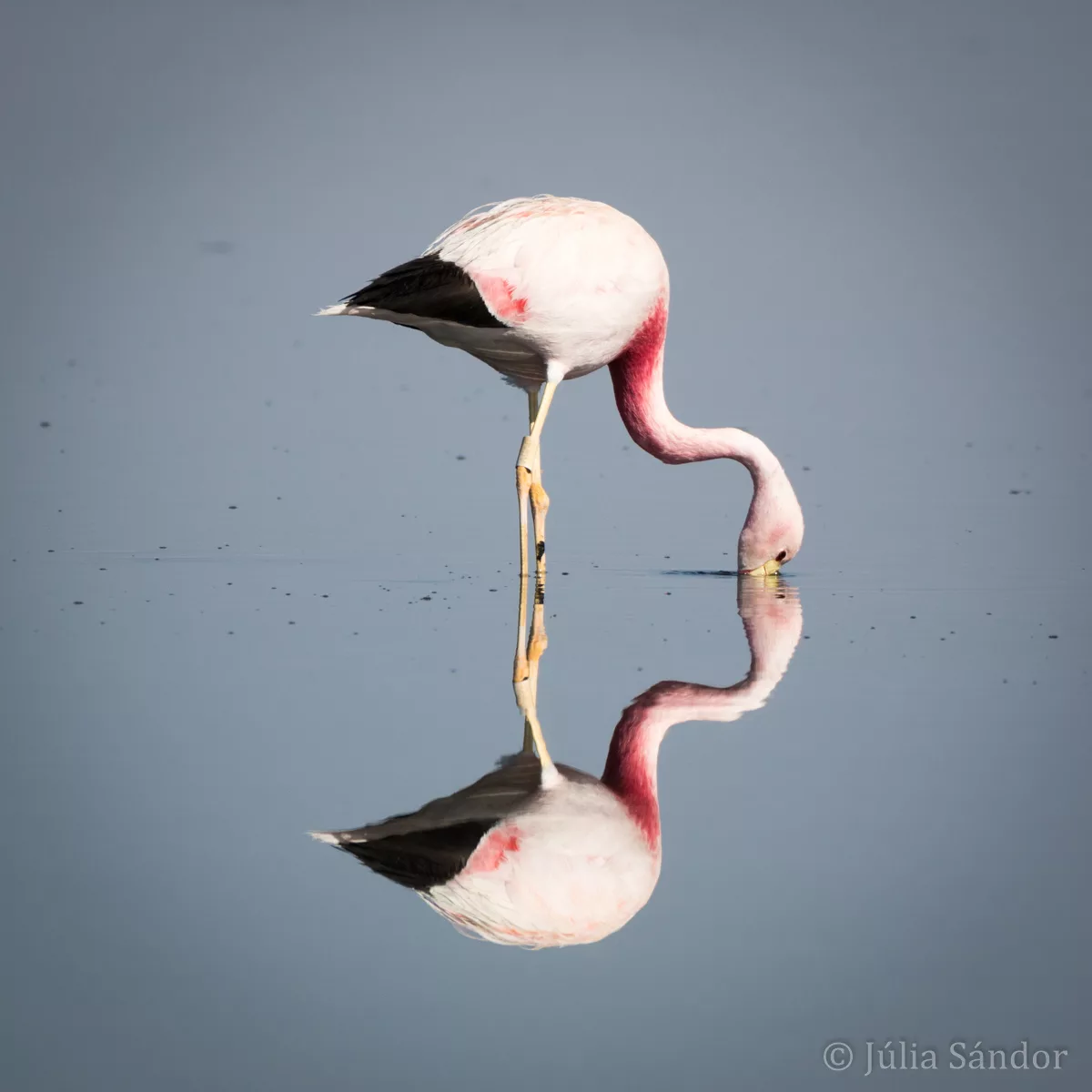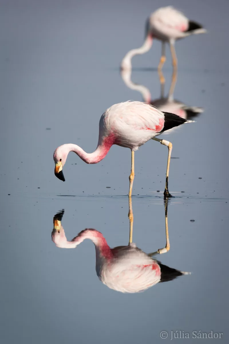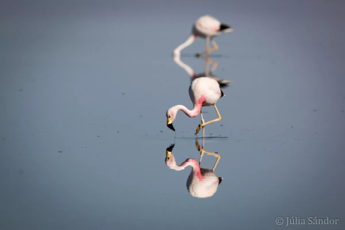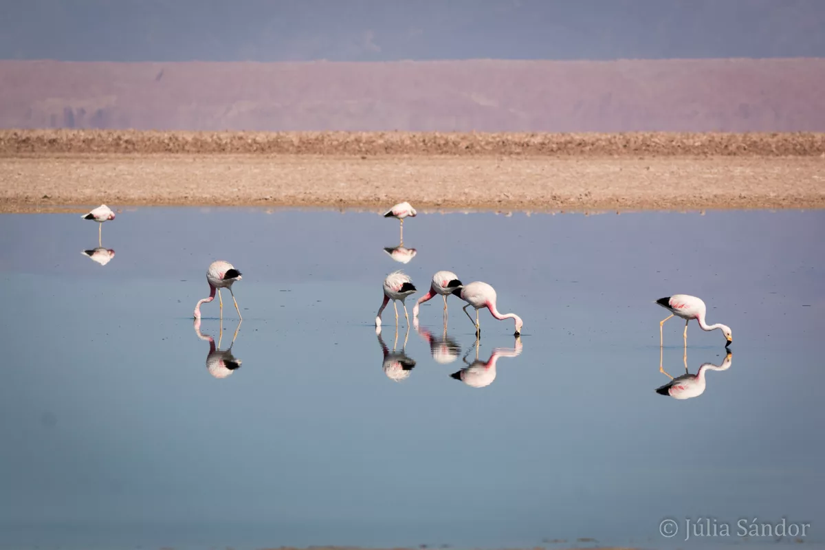 On much lower altitude than the altiplano lagoons – at just 2300 m.a.s.l – we found a number of nice lagoons in the saltflat of the Salar the Atacama. Especially the views at the Chaxa lagoon impressed us with dozens of flamingos which reflect in the motionless water as if they would be standing on a mirror.