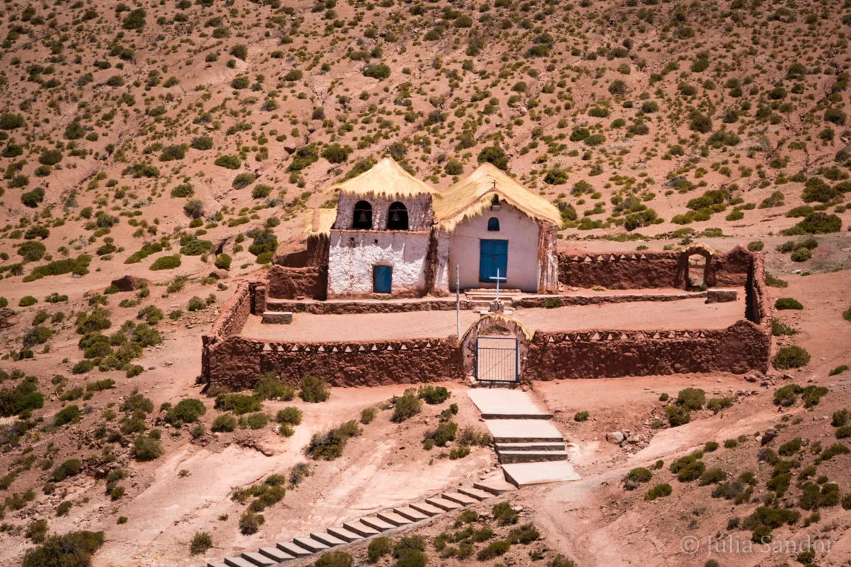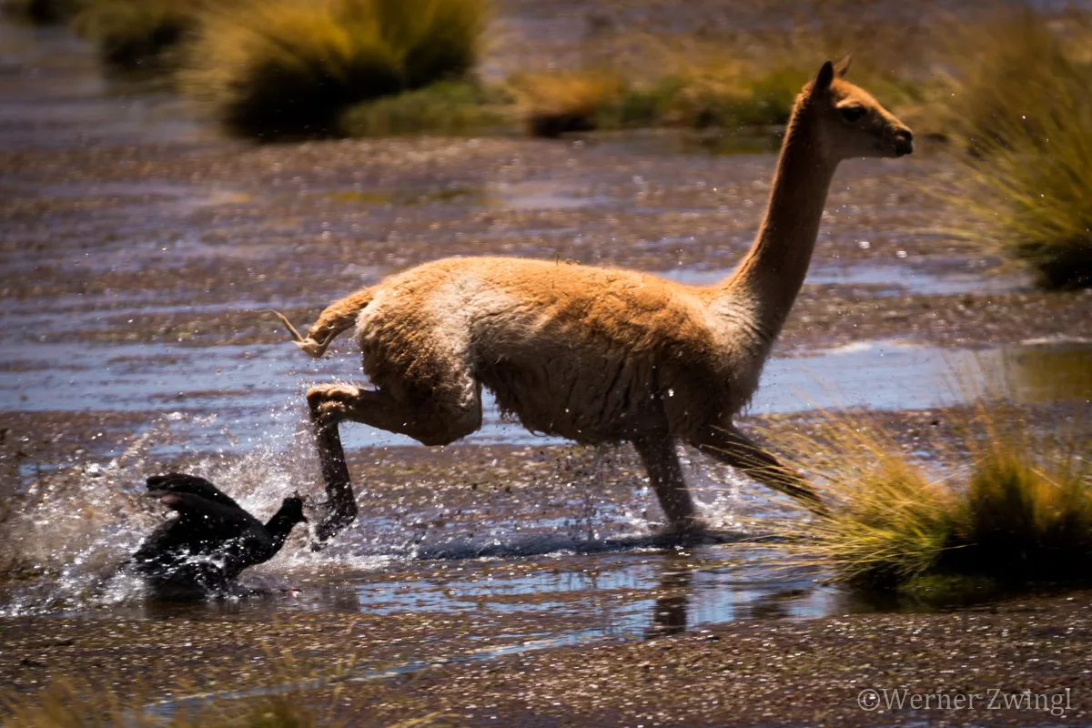 Unfortunately we were not so lucky, as the sky was very cloudy at the time of our visit, and the sun just did not show up: still we say it was worth the trip. The 100 km route along the Rio Puritama is marvelous: lagoons with flamingos and other breeding bird species, wetlands where vicunas and lamas are grazing, volcanos – some of them even spitting fumes and a few tiny villages like Machuca with its picturesque church. Worth the trip!