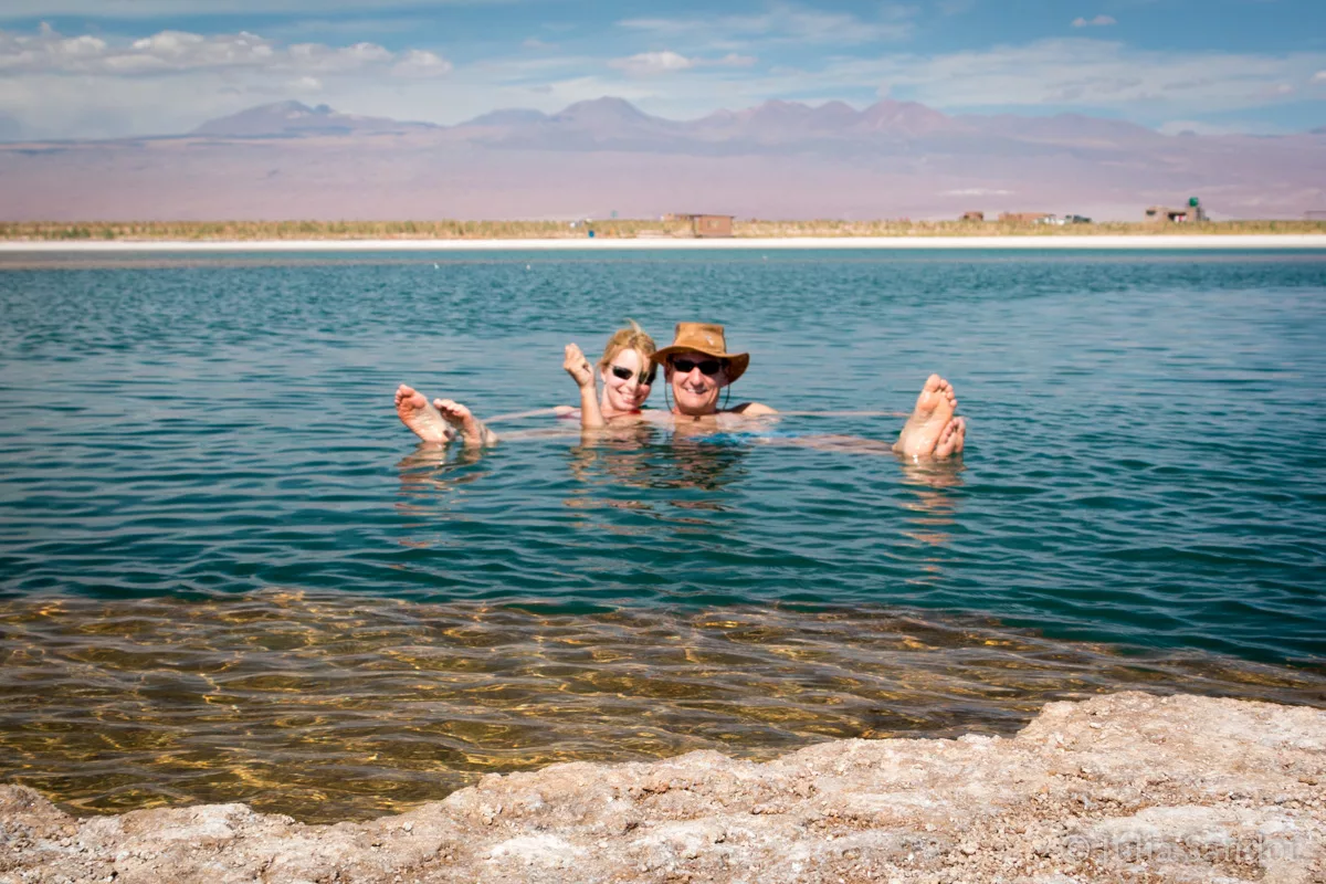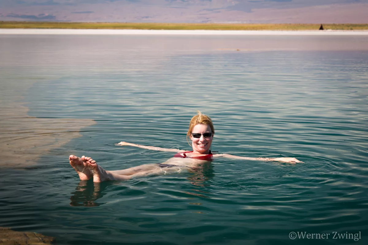 Now this was a very special experience. The Laguna Cejar is one of the lagoons in the Salar where you can take a swim. The fun part is, that the salt content of the water is as dense as the one of the Dead Sea. This means that you are floating, no effort needed to keep you on top of the water. Really cool feeling!