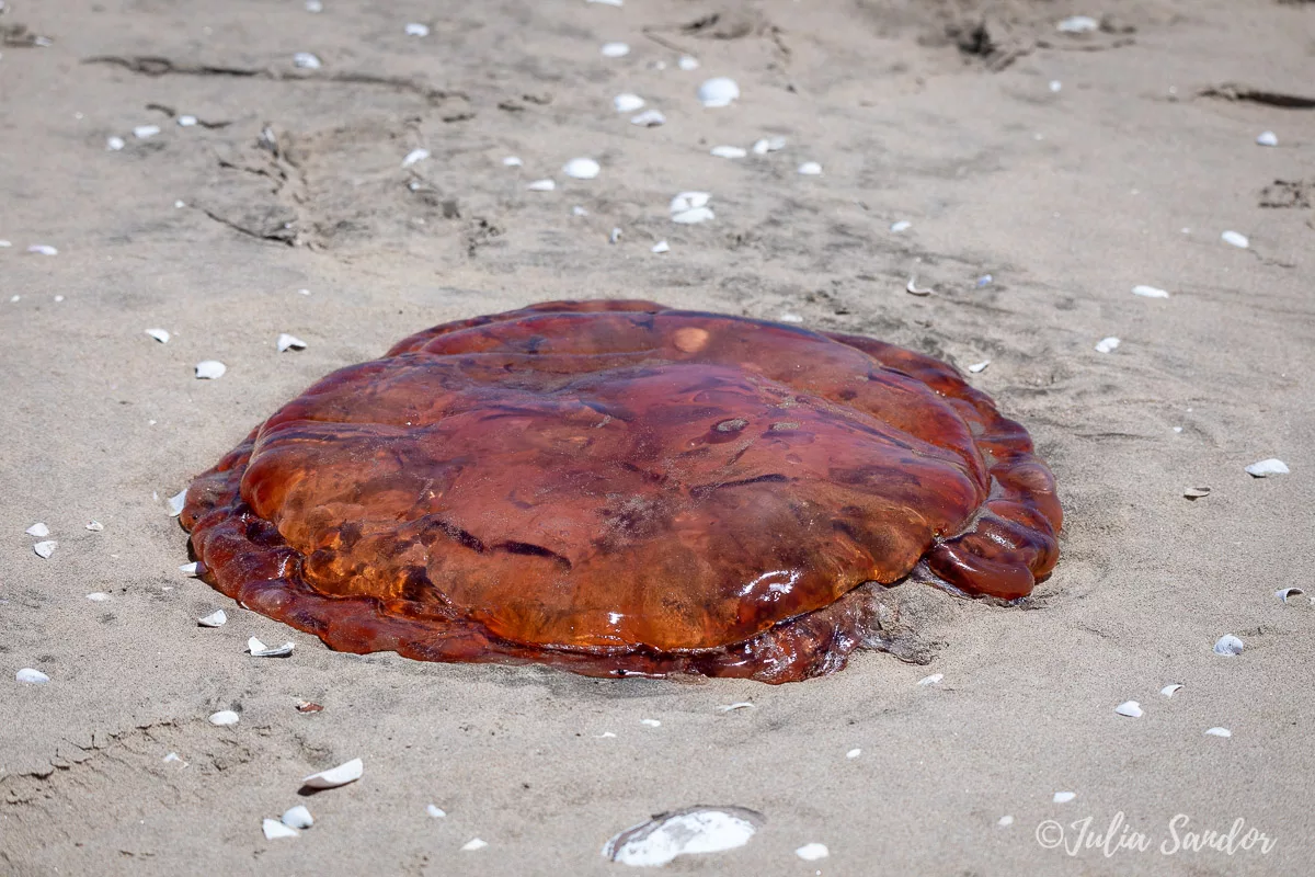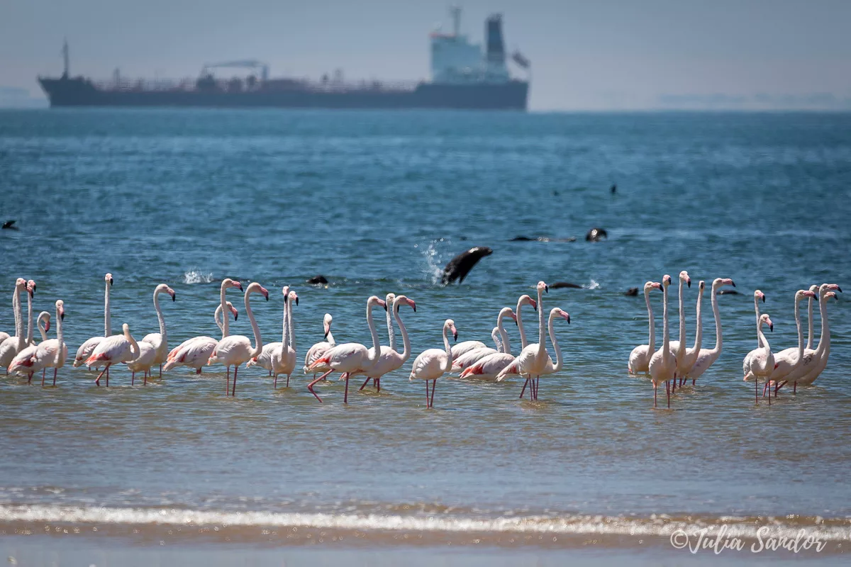 At the end of the peninsula there is a lighthouse and a lodge – they both look completely abandoned, but allegedly the lodge is in operation. We are completely alone here, if you don’t count the hundreds of seals, flocks of flamingos, pelicans, a big variety of water birds and some jelly fish which are left in the sand from high-tide.