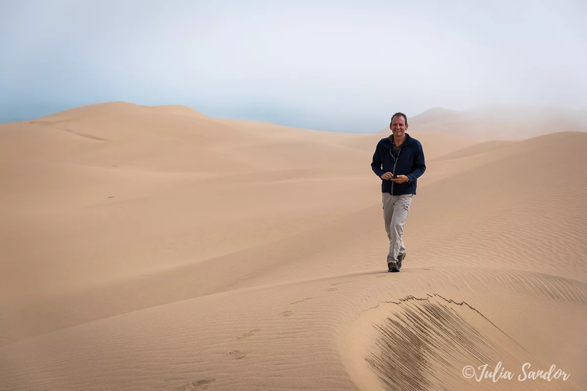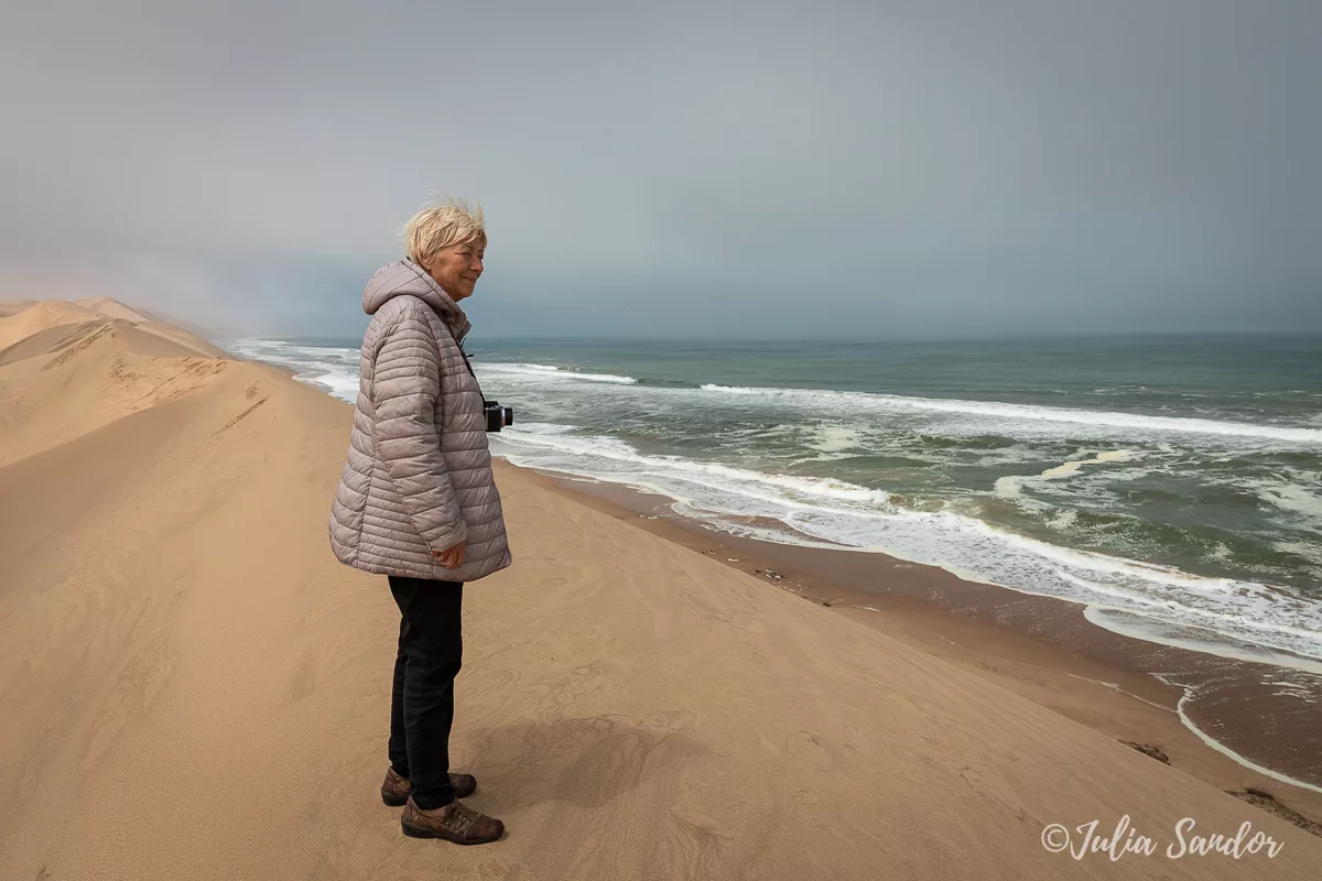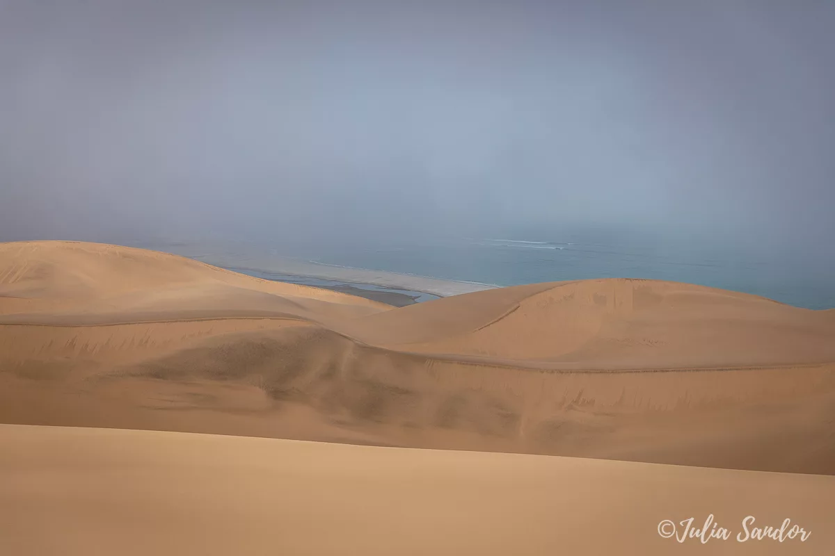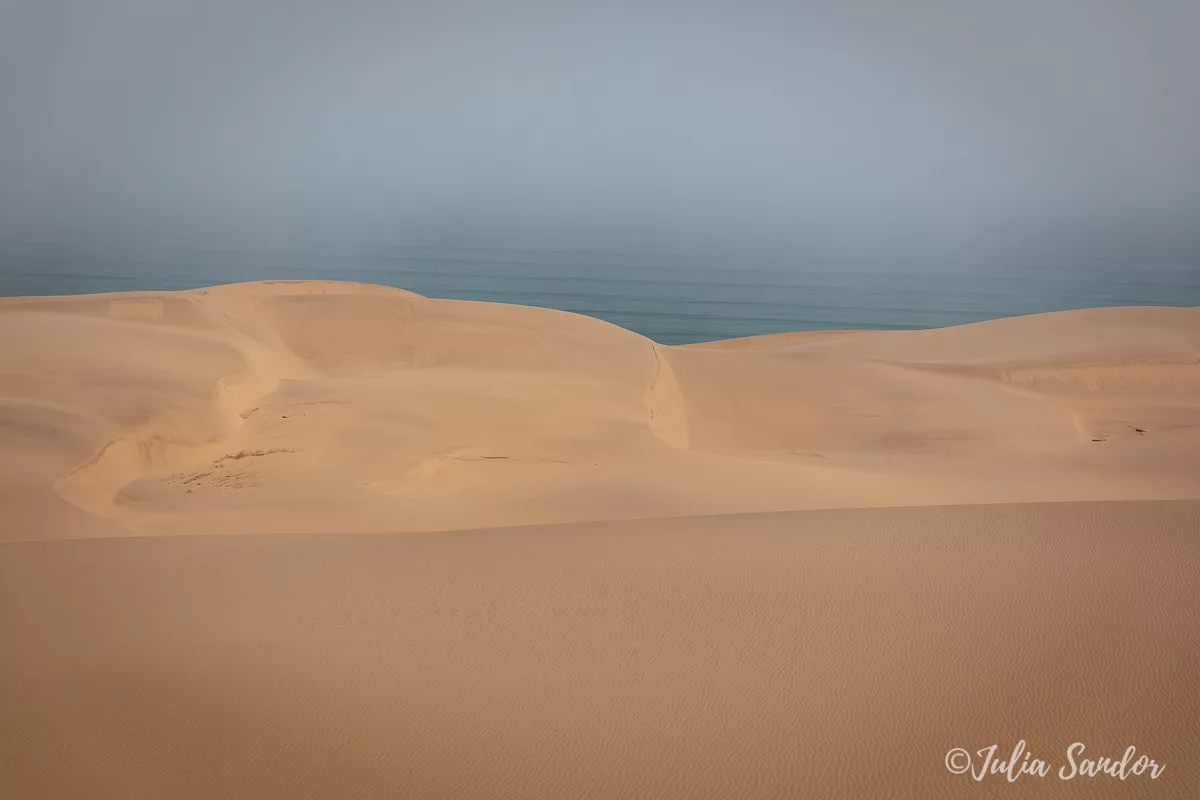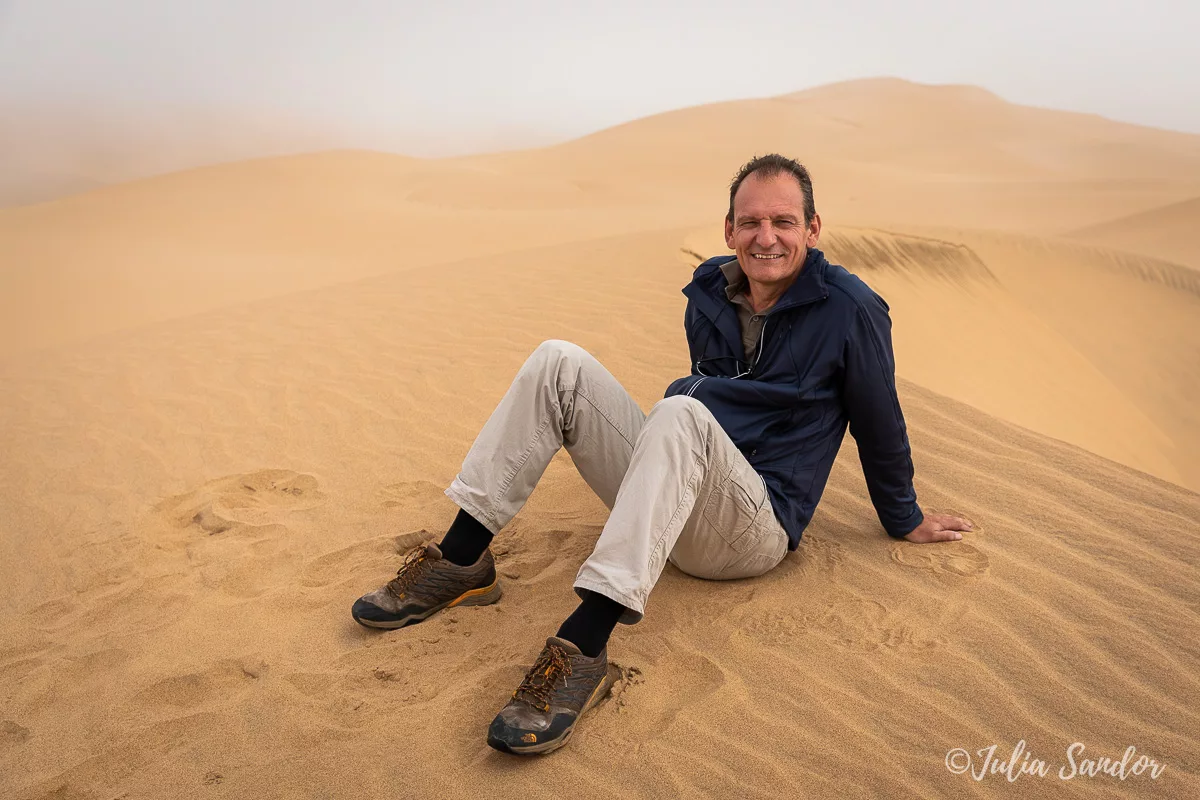 We drive around in the dunes, finally Ati stops the car on top of a real high one, we get out, walk around and wait for the fog to lift. And when the Sun comes out, it is like a miracle. We see the blue waves of the Ocean from way up, standing on the edge of the red sand dune – the view is surreal.