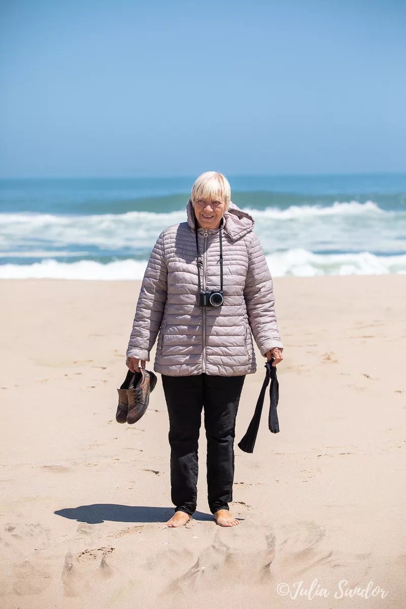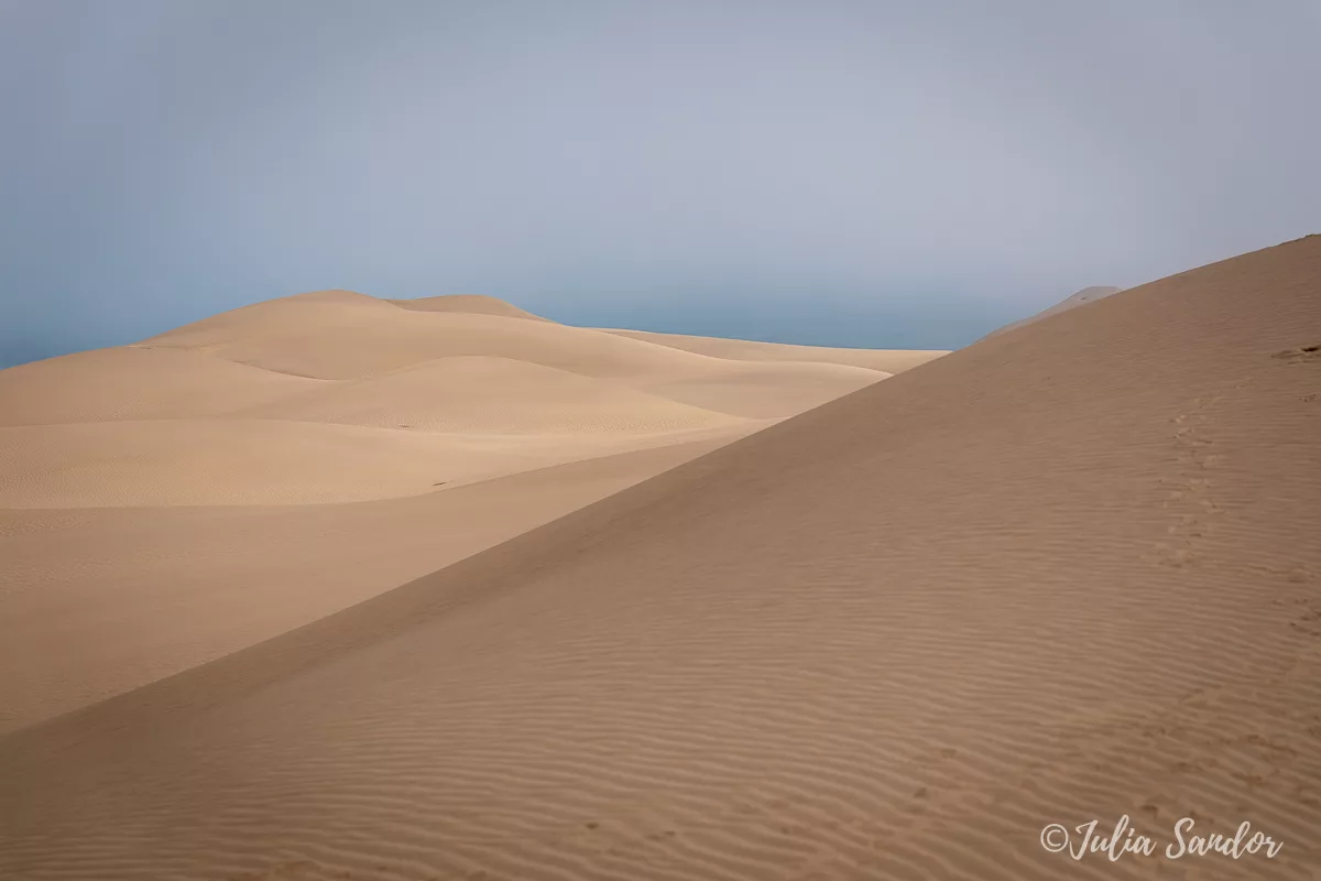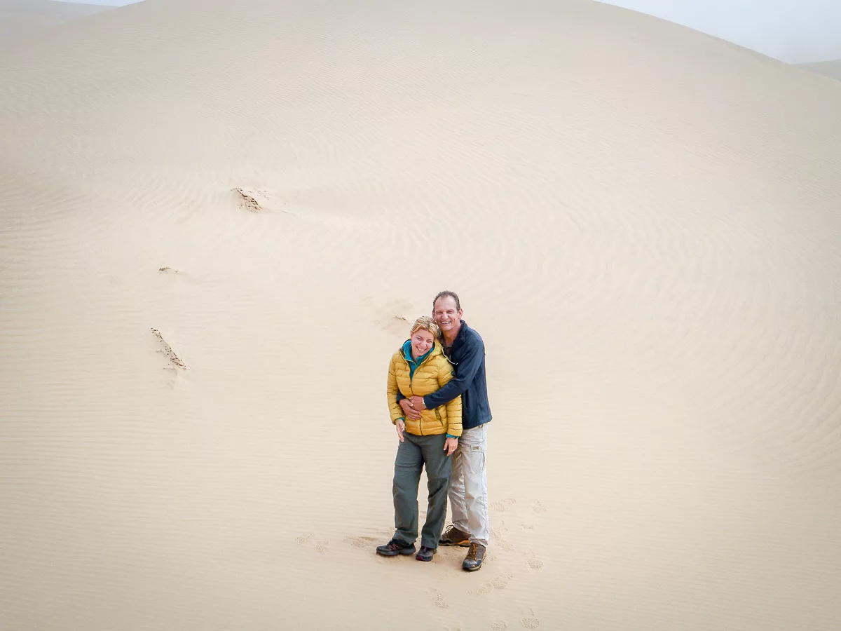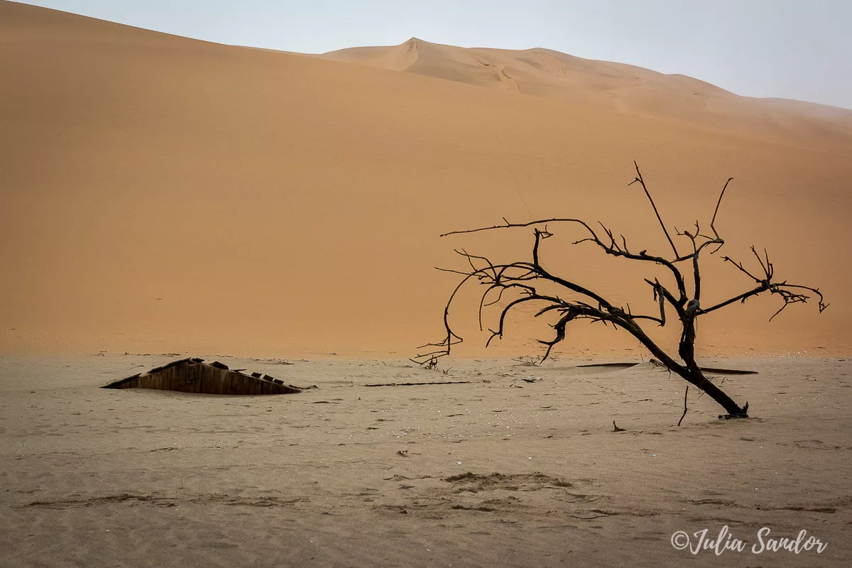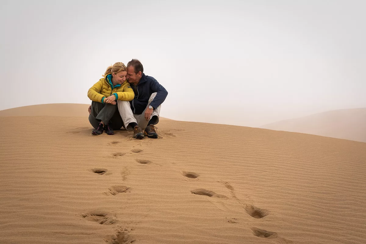 We drive around in the dunes, finally Ati stops the car on top of a real high one, we get out, walk around and wait for the fog to lift. And when the Sun comes out, it is like a miracle. We see the blue waves of the Ocean from way up, standing on the edge of the red sand dune – the view is surreal.
