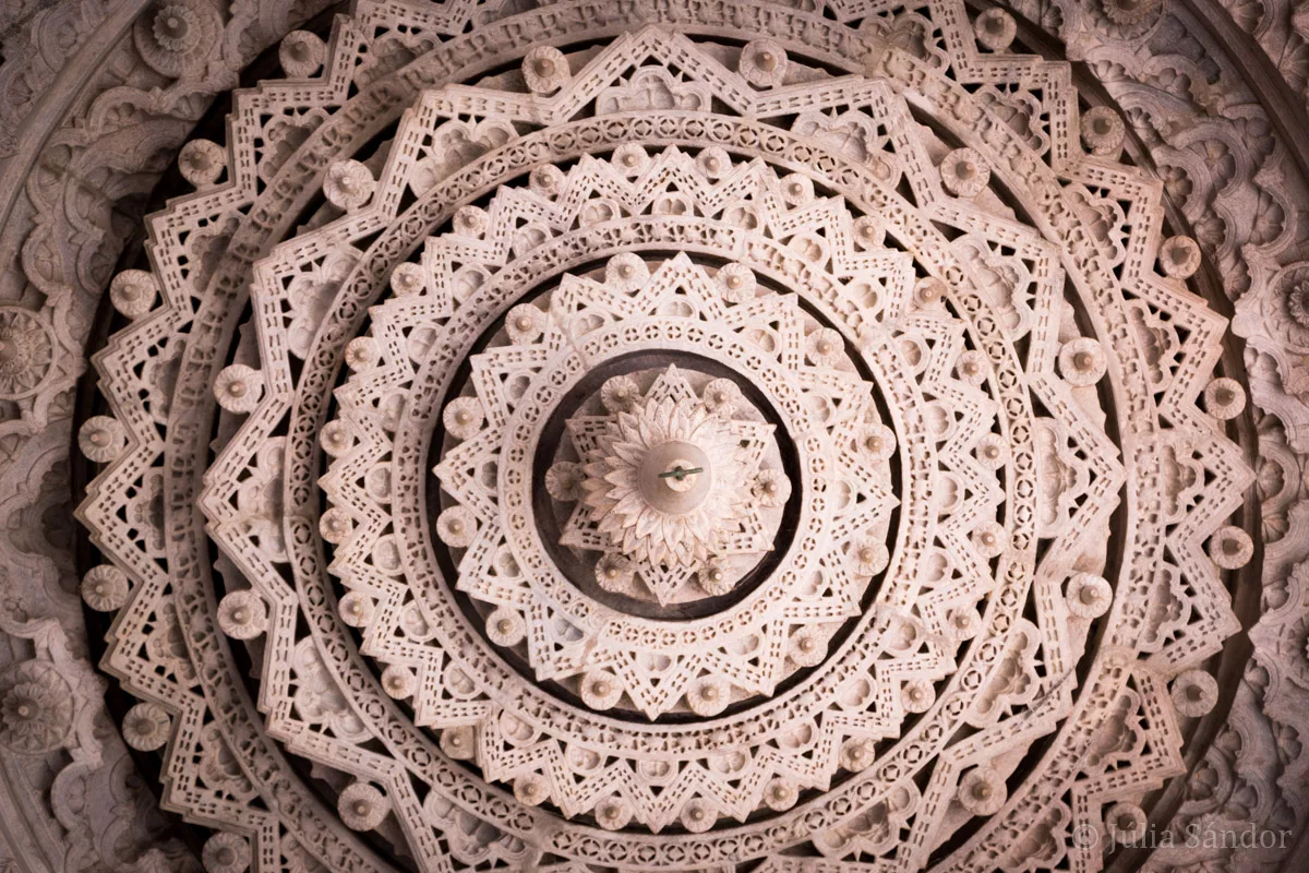 The main temple is a huge, white, 3-story marble structure. The stone came from Makrana, where the materials of the Taj Mahal also originate from. The temple has 1440 pillars, all with different, very elaborated, fine carving. Its´ domes and ceilings also have beautiful marble ornaments.